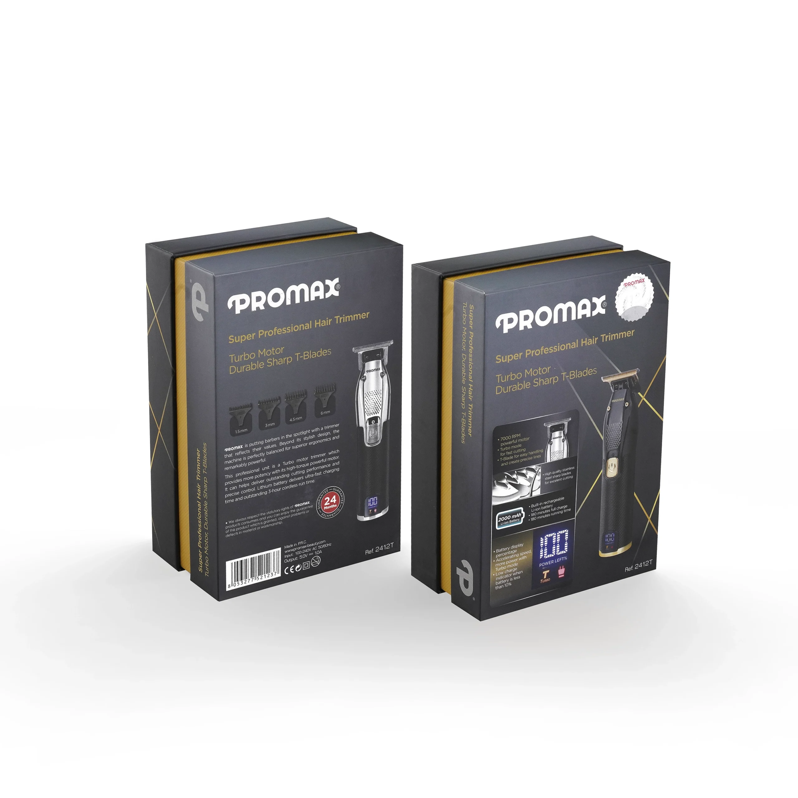 ماشین اصلاح های تریمر محصولاتی هستند که برای انجام کارهای ظریف روی صورت، گردن و موی سر بکار می روند. این دستگاه ها دقت بیشتری نسبت به دستگاه های کلیپر دارند. ماشین اصلاح تریمر پرومکس مدل 2412T یکی از جدید ترین و زیبا ترین مدل تریمر این برند هستند که به تازگی به بازار معرفی شدند. این محصول علاوه بر زیبایی و جذابیت ظاهری فوق العاده دارای قابلیت توربو می باشد. قابلیت توربو به معنی افزایش دور موتور برای انجام اصلاح سریعتر می باشد. تیغه این دستگاه از نوع T-Blade است که می تواند سطح بیشتری از موها را در آنِ واحد تحت پوشش قرار دهد.